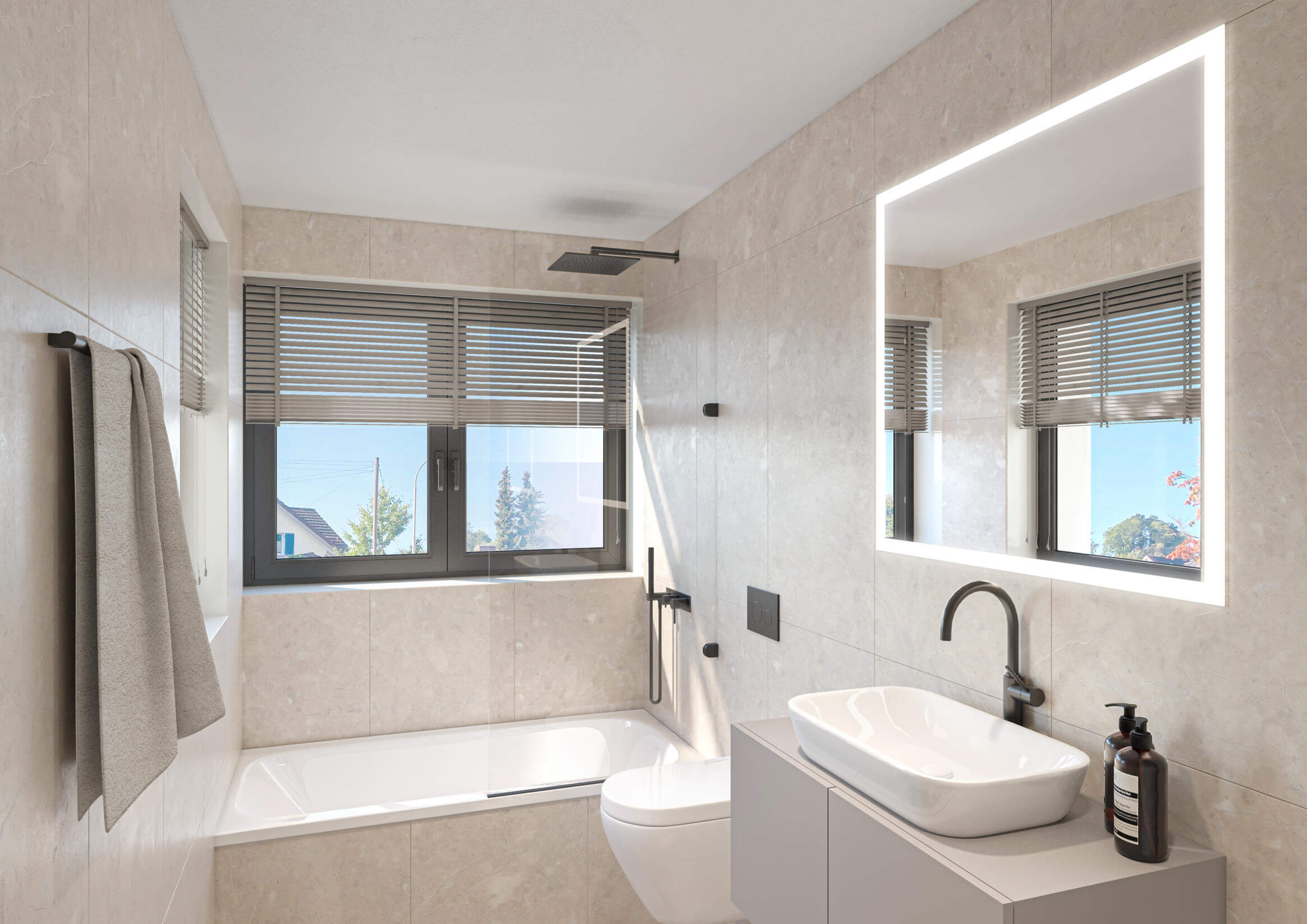 Alle genannten Informationen sind unverbindlich. Projektänderungen, Layoutanpassungen und Abweichungen der Materialien und Möbel in den dargestellten Visualisierungen bleiben bis zur Bauvollendung vorbehalten. Die einzigen verbindlichen Informationen sind die Angaben im Kaufvertrag und in dessen Anhänge.