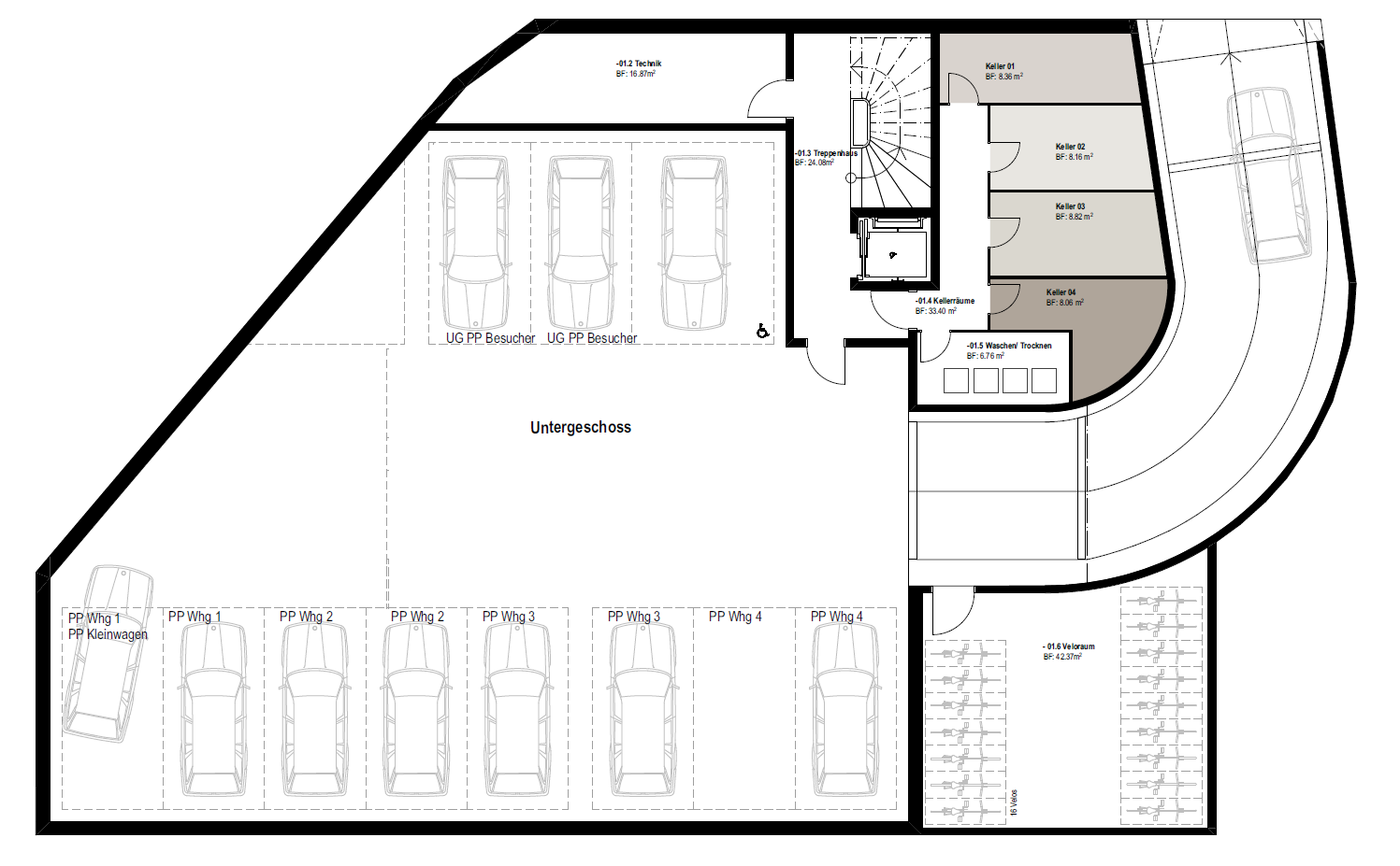 Apparate in Bädern, Duschen und WC’s werden dem Käufer durch den Architekten vorgeschlagen. Waschmaschine und Tumbler sind im Keller eingeplant.